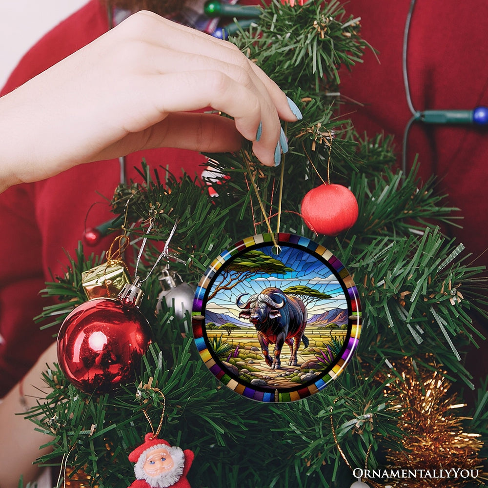 African Buffalo Wildlife Encounter Stained Glass Style Ceramic Ornament, Safari Animals Christmas Gift and Decor
