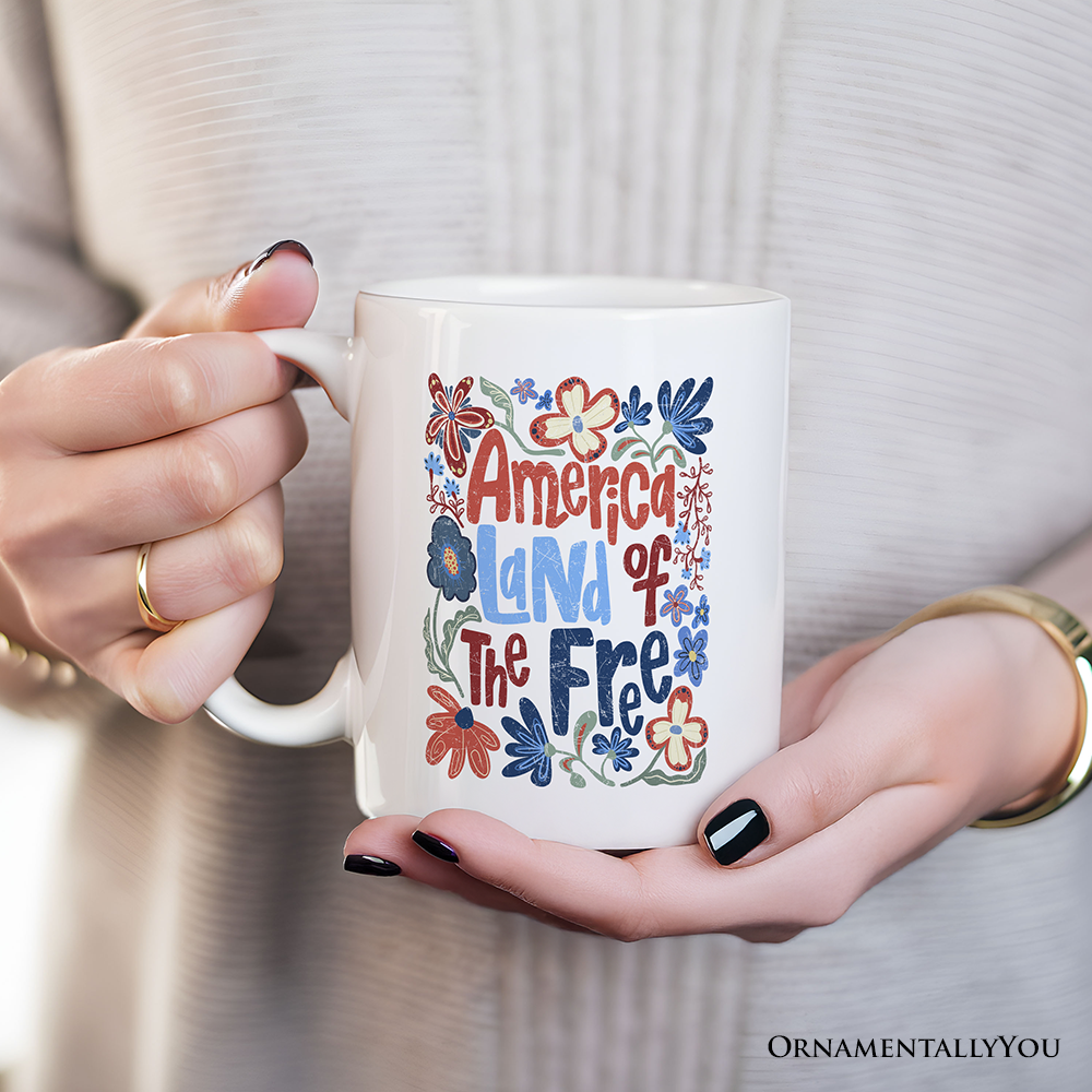 America Land of the Free Personalized Mug, Retro Floral Independence Day Gift with Custom Name