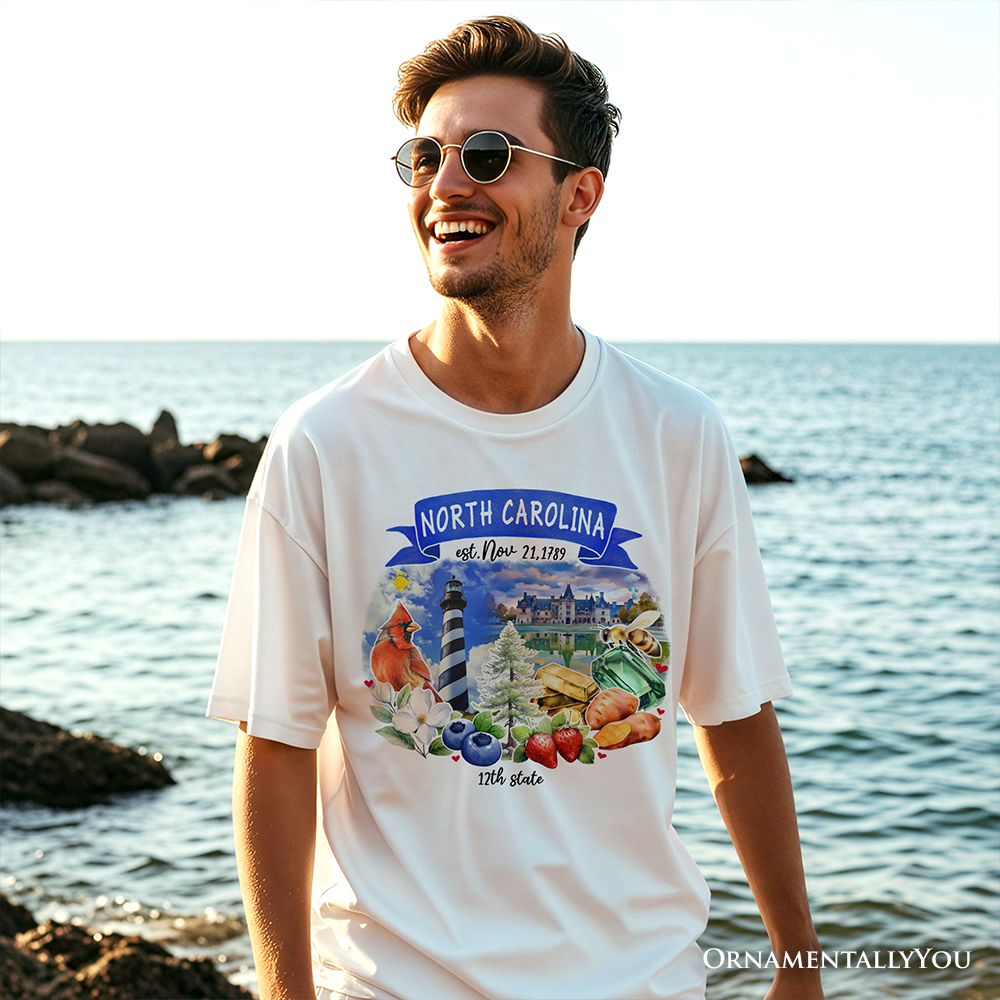 Explore the rich heritage and stunning landmarks of North Carolina with this artistic tee showcasing famous sites like the Blue Ridge Mountains, Wright Brothers Memorial, and historic coastal lighthouses 🌄✈️🌊. Crafted for history buffs and travel lovers, this comfortable unisex shirt combines style and state pride, perfect for everyday wear or as a thoughtful gift for those passionate about North Carolina’s natural beauty and cultural legacy.
