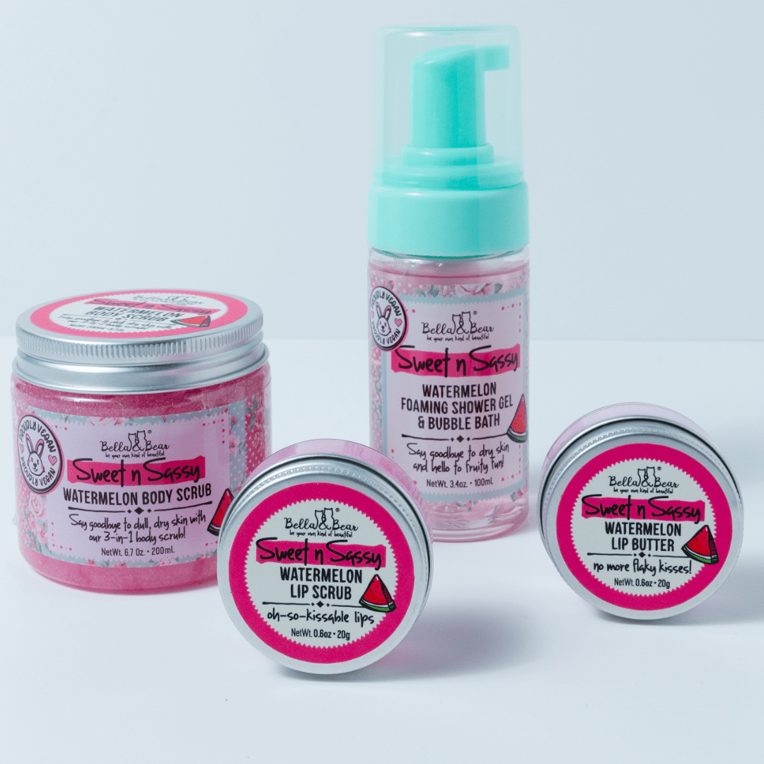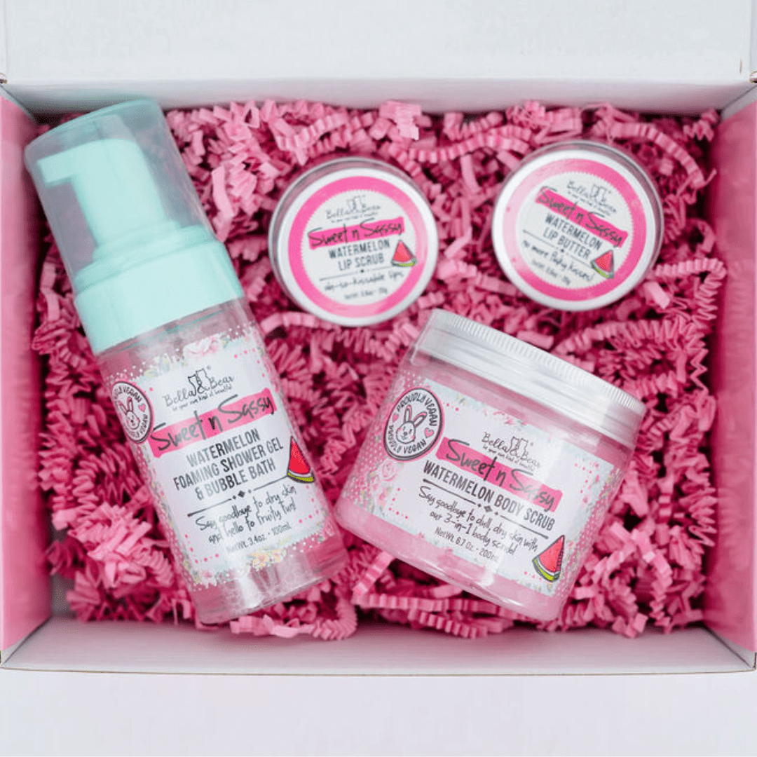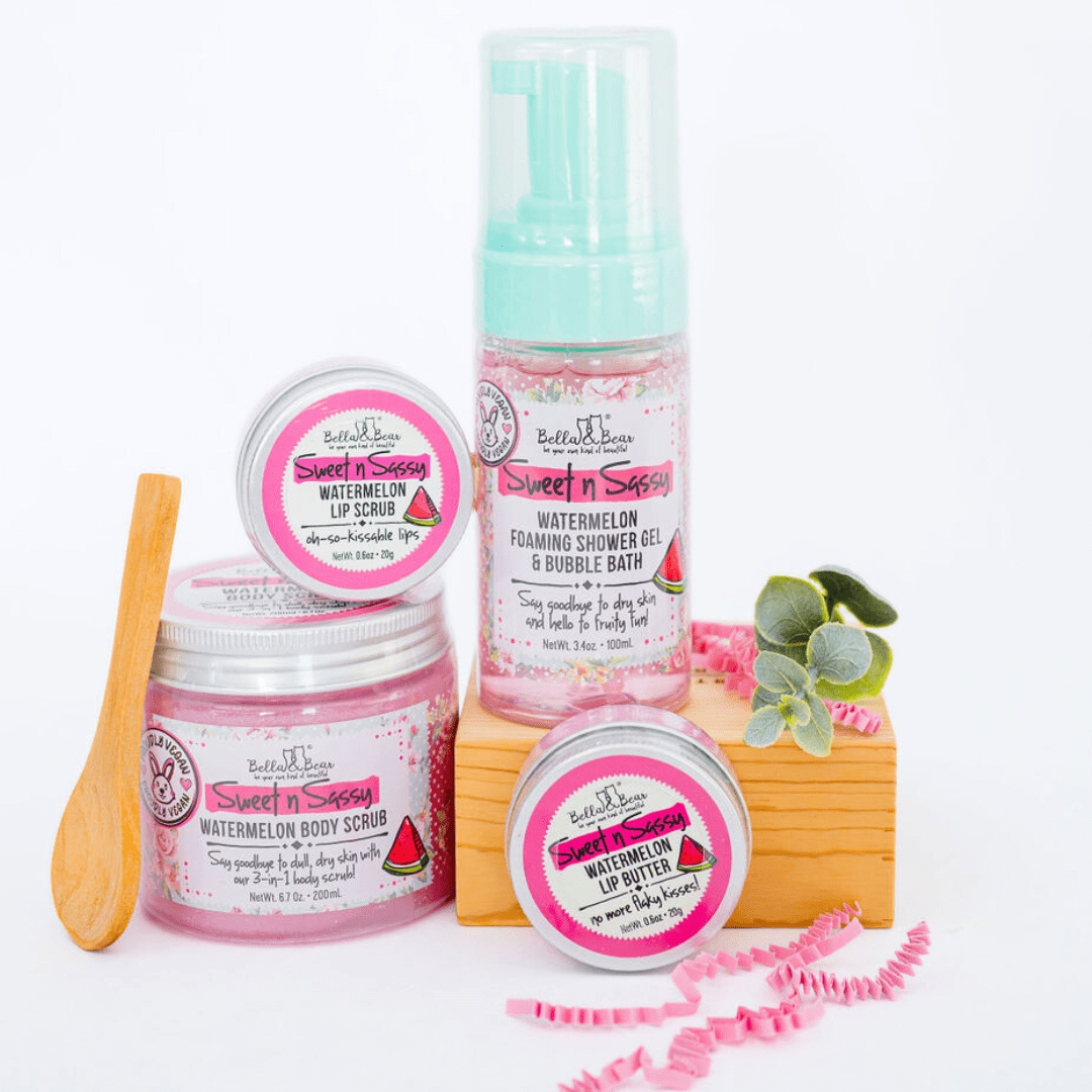 Bella & Bear Sweet 'n' Sassy Watermelon Gift Set Foaming Body Wash & Bubble Bath, Body Scrub, Lip Butter & Lip Scrub