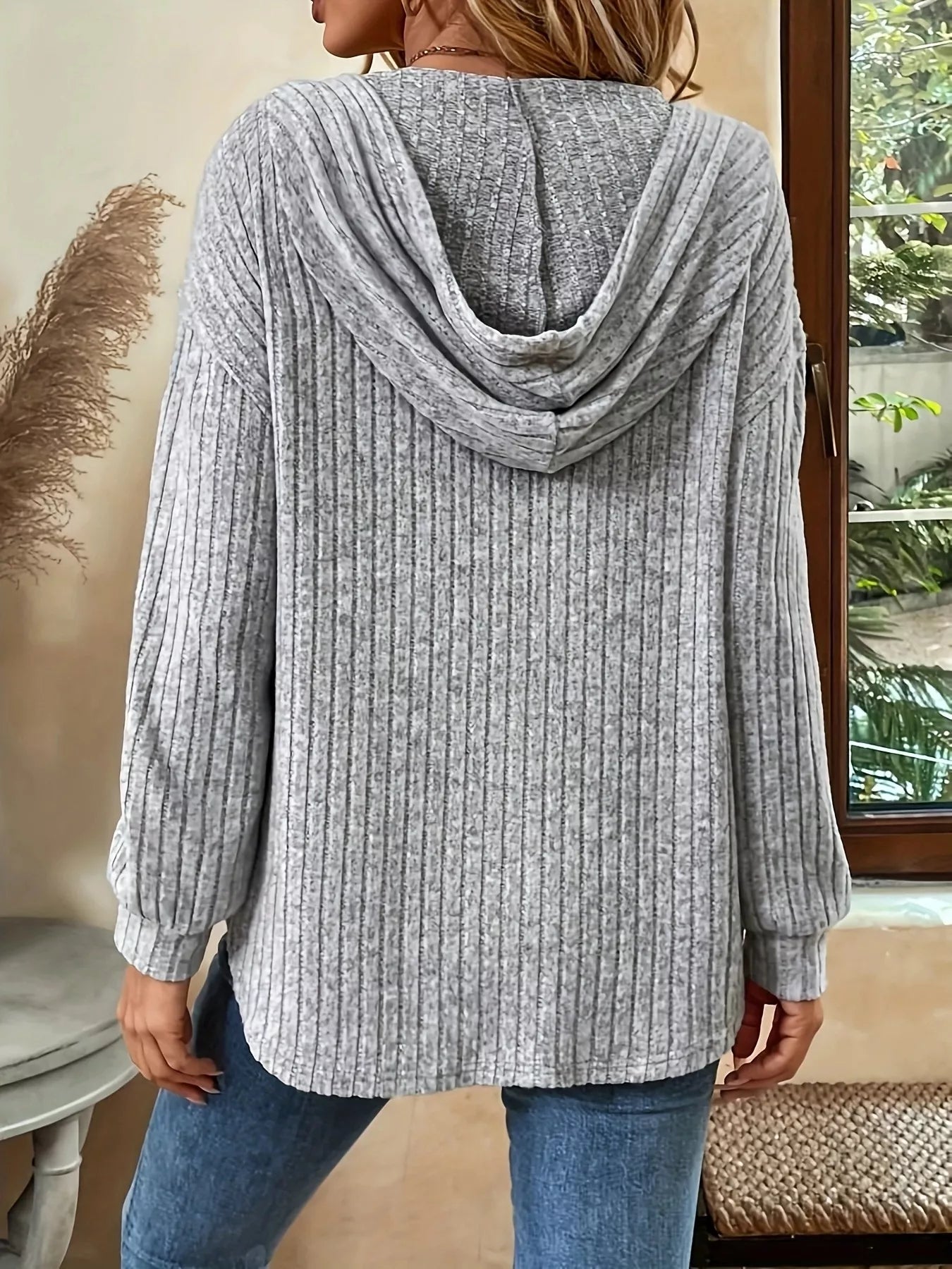 Casual Ribbed Button Detail Hoodie