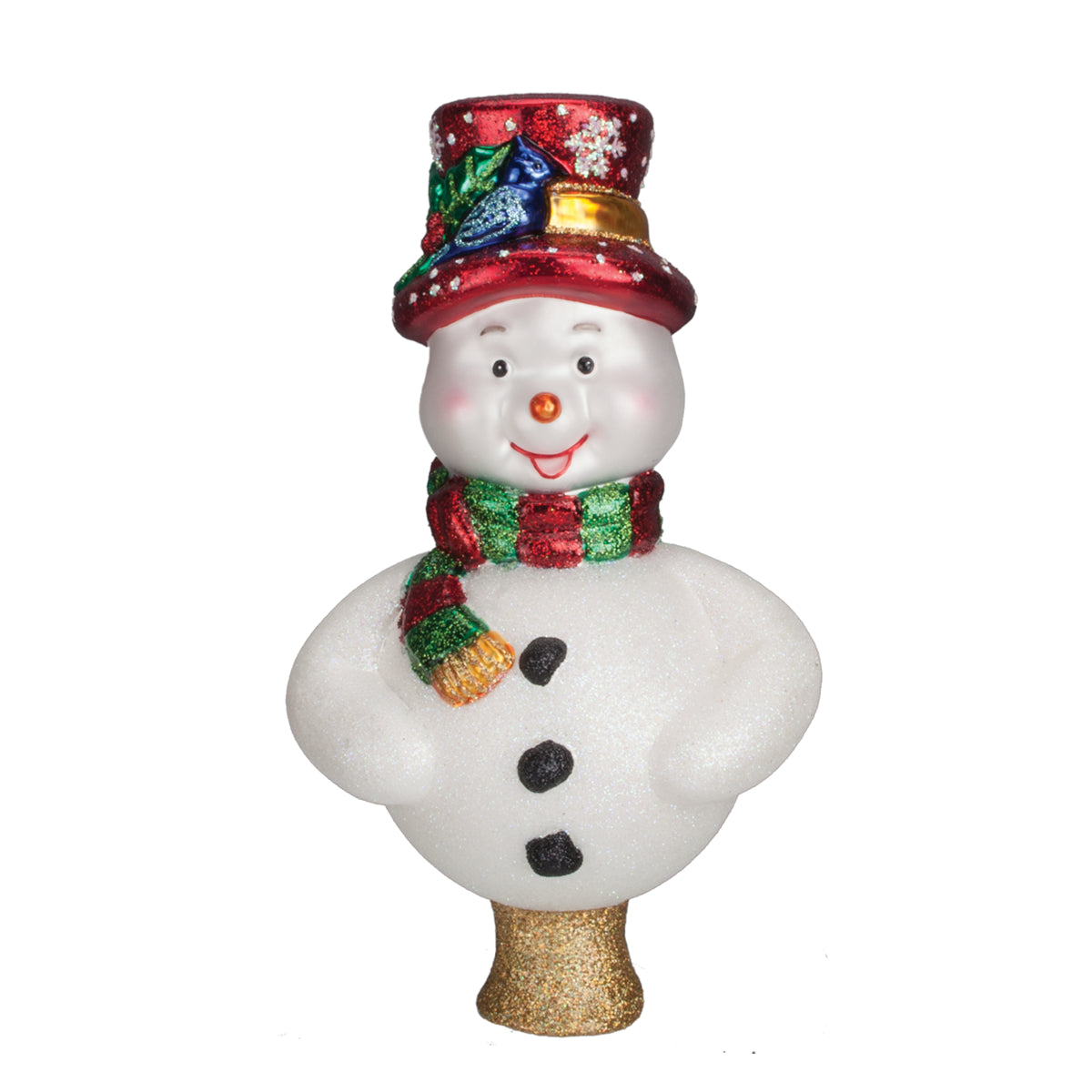 Add some wintery fun to your Christmas tree by adding Frosty the Snowman atop your Tannenbaum! Our Frosty Tree Top is a whimsical way to adorn your Christmas tree. Each Christmas tree topper is made of blown-glass, which is then painstakingly hand-painted and glittered, then individually packed in an Old World Christmas printed gift box. Our Frosty Tree Top makes a thoughtful housewarming gift, creating a new Tradition to Cherish.