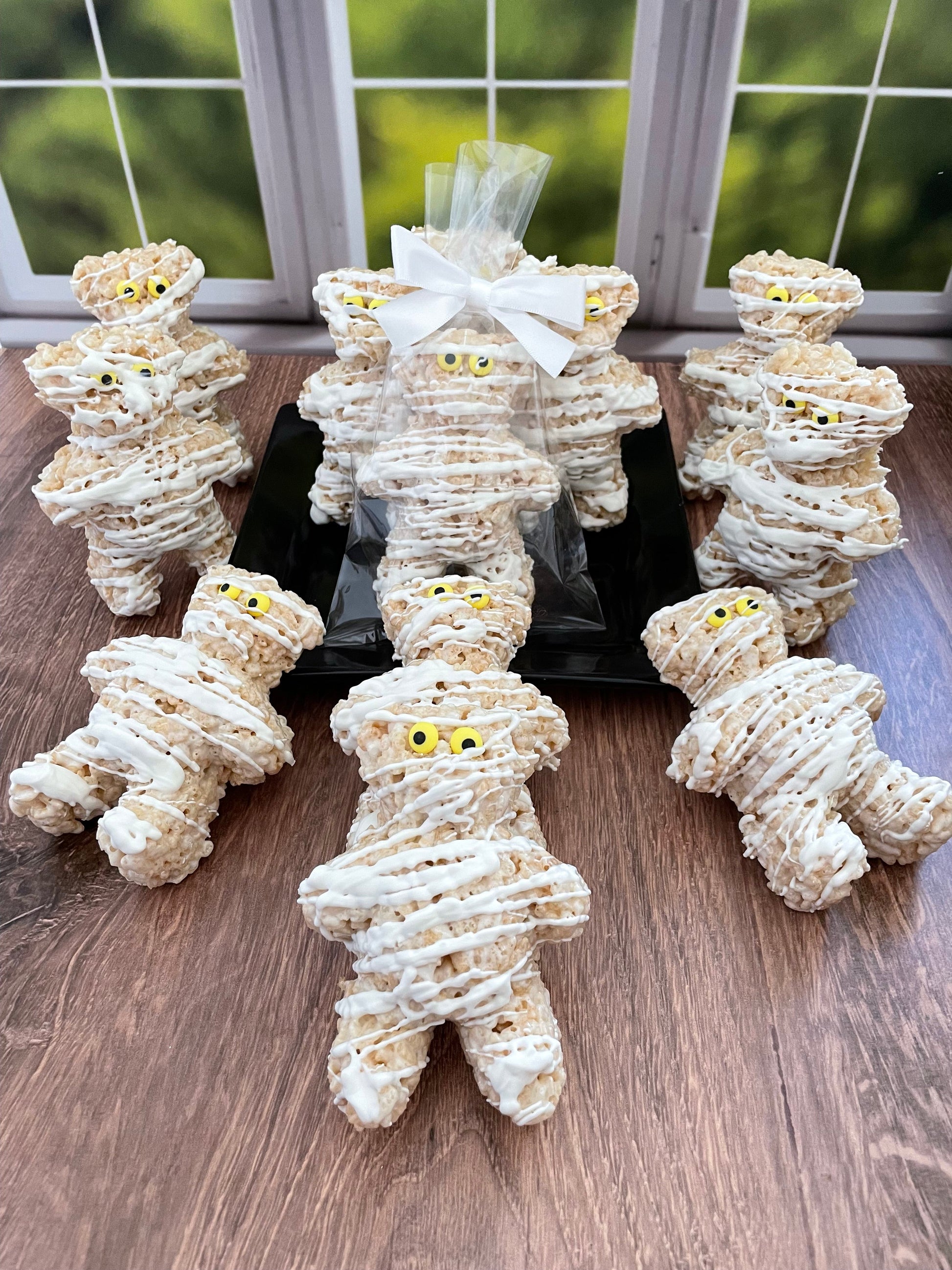 Halloween "Mummy" Bear Rice Crispie Treats come decorated with candy eyes and white chocolate.