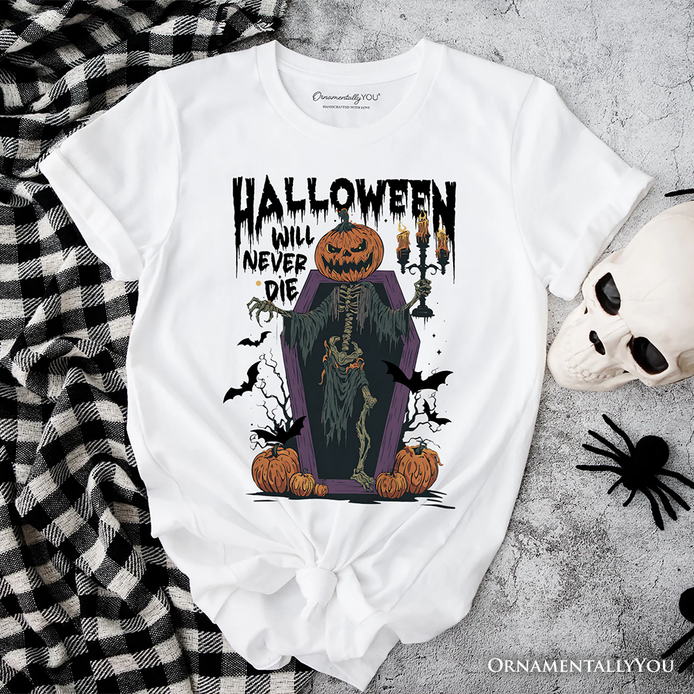 Halloween Will Never Die T-Shirt, Vintage Pumpkin Coffin Skeleton Tee