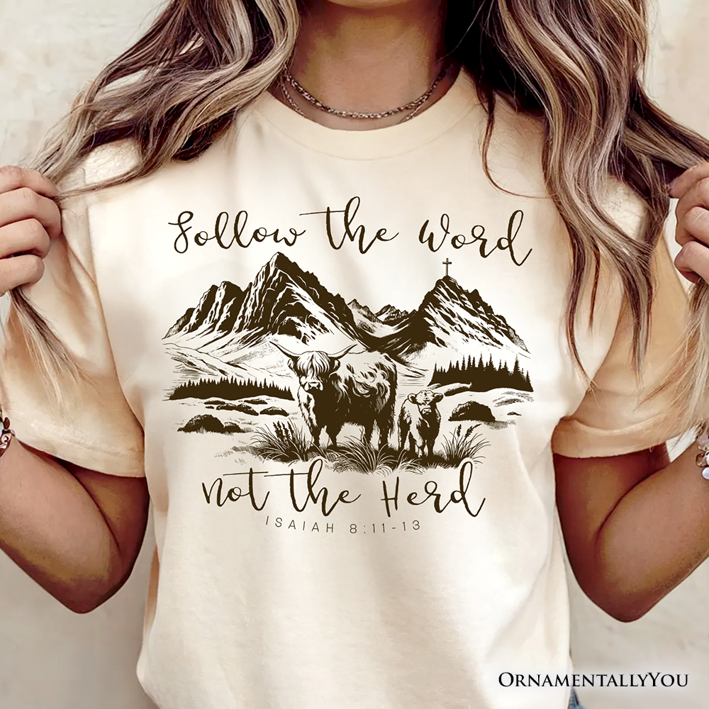 Highland Cow Isaiah 8:11-13 Christian T-Shirt, Follow the Word Not the Herd Bible Verse Western Tee