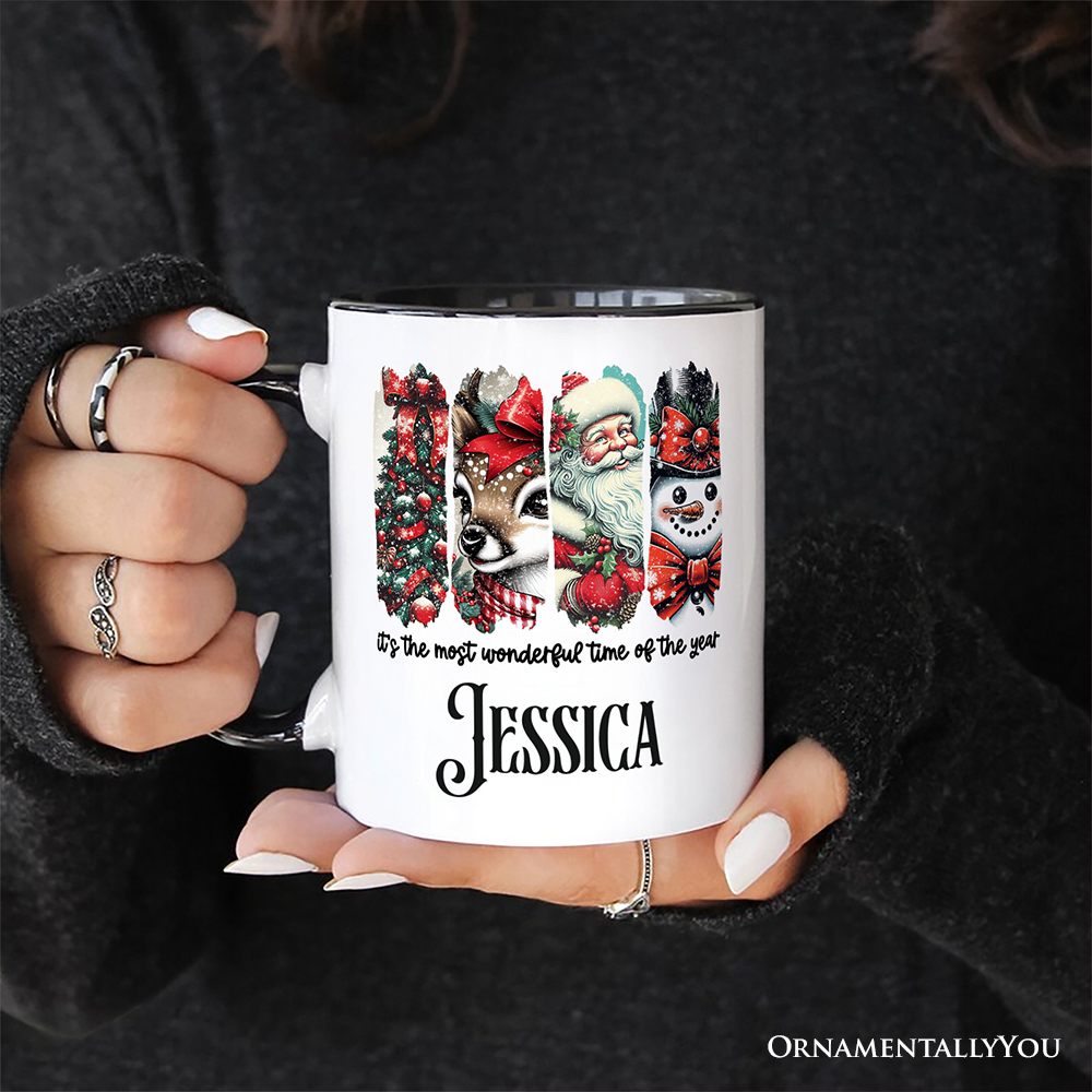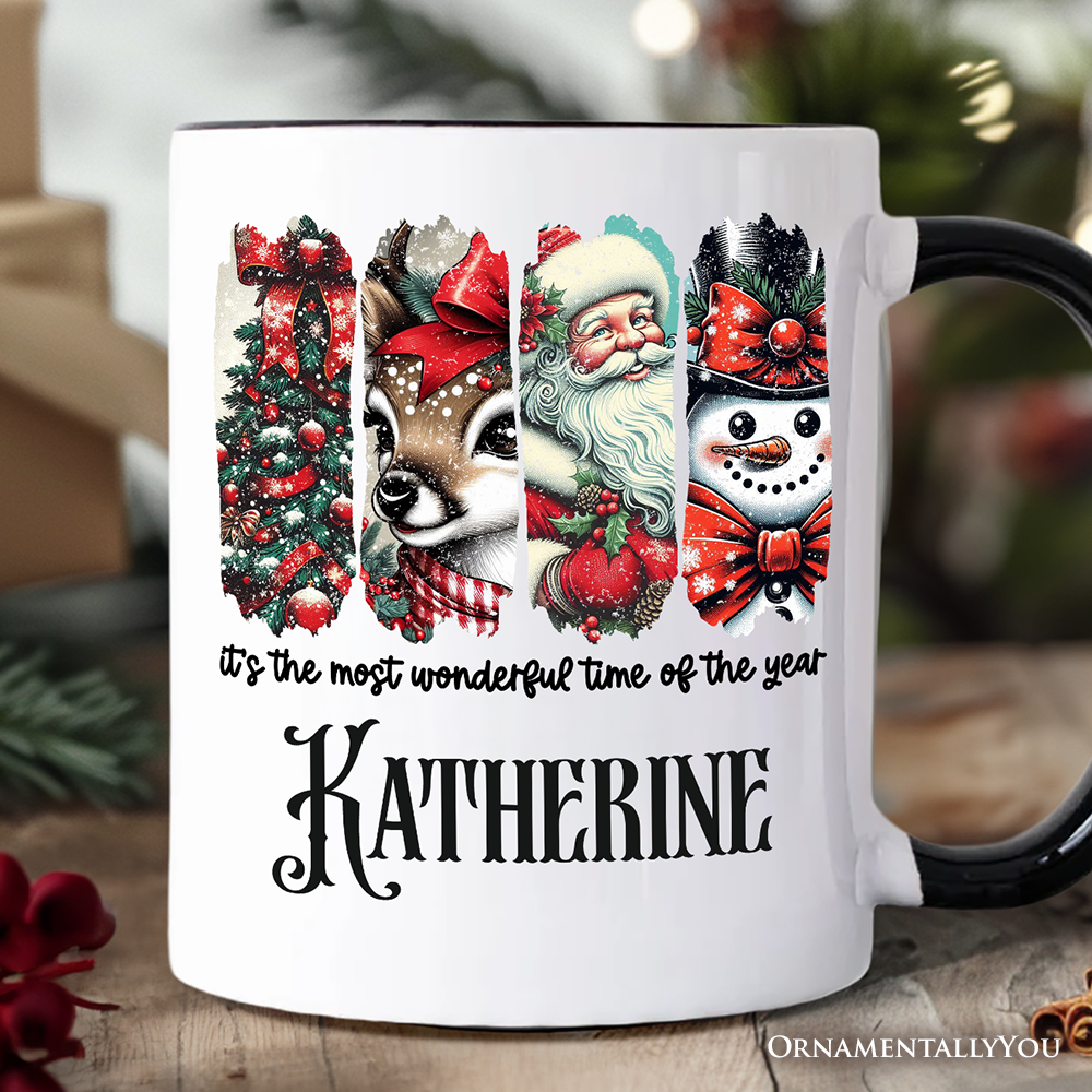 It's the Most Wonderful Time of The Year Personalized Mug, Reindeer, Santa, Snowman Vintage Gift with Custom Name