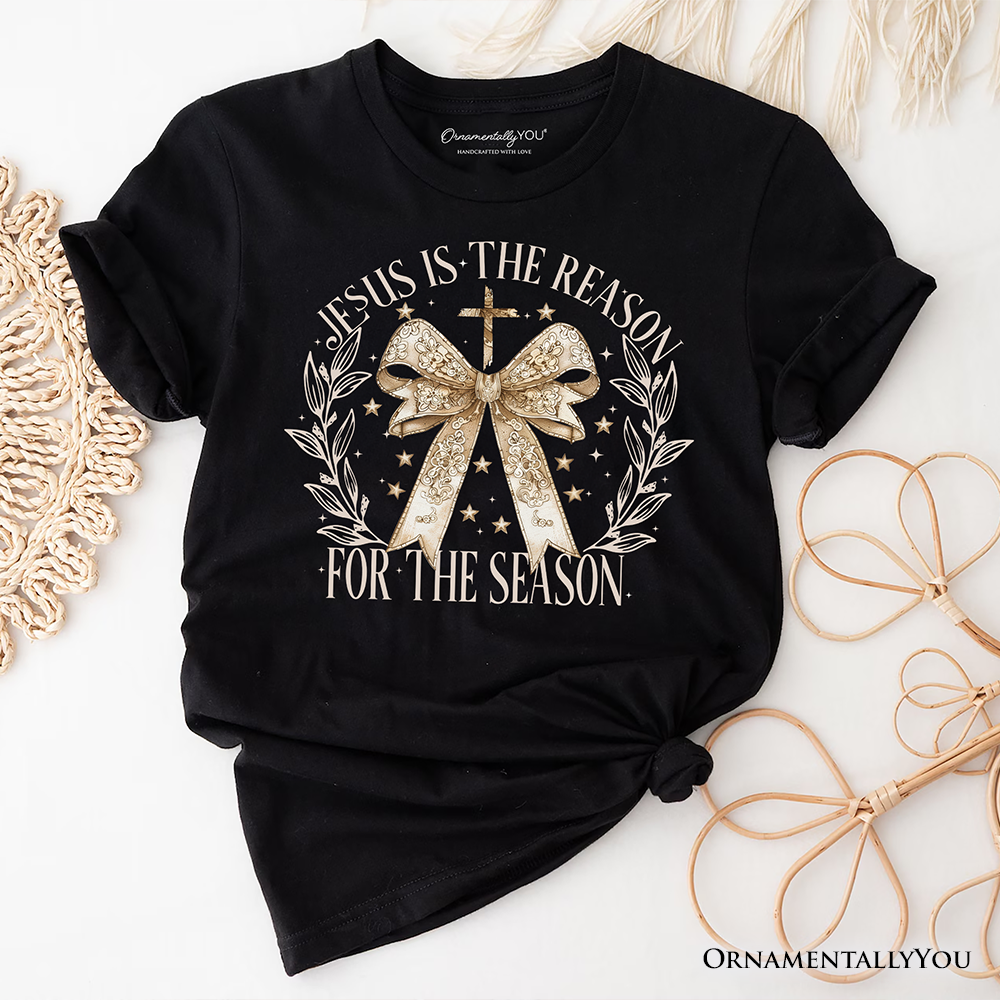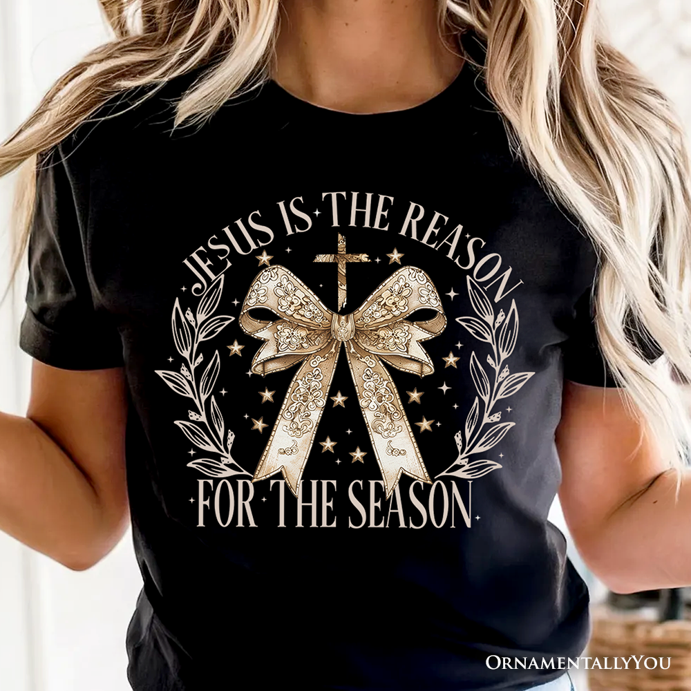 Jesus Is the Reason Christmas T‑Shirt, Coquette Gold Bow Cross Tee for Faithful Women