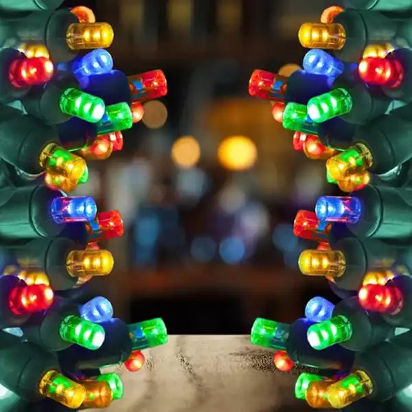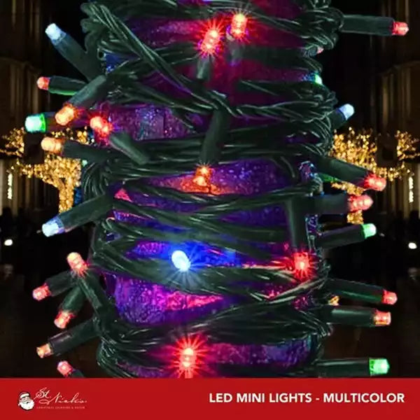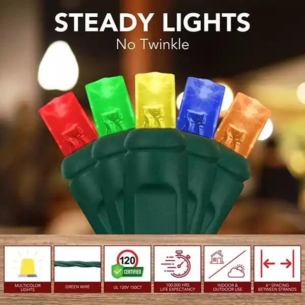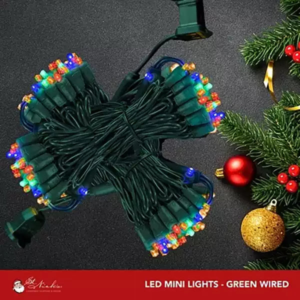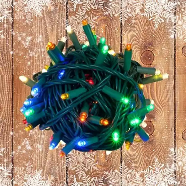 Elevate your holiday decor with 5mm \Multicolor LED Mini Lights on Green Wire. 50 lights with 3-inch spacing, perfect for creating a festive atmosphere both indoors and outdoors.