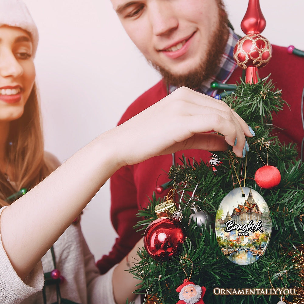 Capture the vibrant essence of Thailand's capital with this stunning Bangkok ornament. Showcasing the city's dynamic blend of ancient temples and modern skyline, this piece celebrates Bangkok's rich history. Whether you're reminiscing about your travels or gifting a lover of Thai culture, this artistic keepsake offers a unique tribute to the iconic city. Perfect for adding an exotic touch to your holiday decor or as a beautiful reminder of Thailand's bustling charm. 🏙️🎋🎄