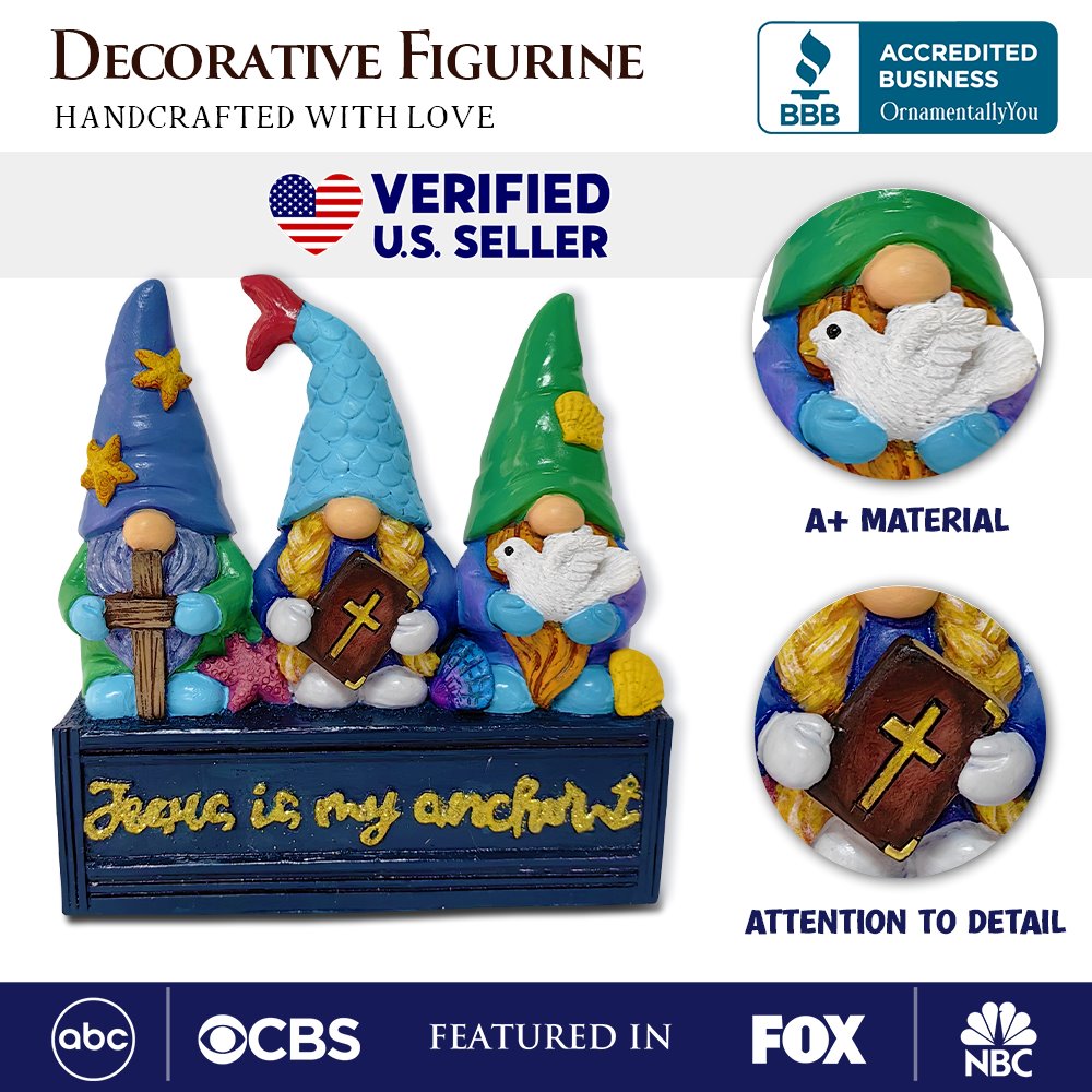 Discover the perfect blend of whimsy and faith with these vibrant nautical-themed gnome figurines, a delightful addition to any beach house, garden, or shelf display. Featuring three colorful gnomes, each adorned with sea-inspired motifs like starfish and seashells, and holding symbols of Christian faith, including a cross and a dove. The base is charmingly inscribed with "Jesus is my anchor," making it not only a decorative piece but also a heartfelt expression of spiritual grounding. These figurines are ideal for enhancing a coastal decor theme or as a thoughtful gift for loved ones who cherish both their faith and the sea. Bring a splash of joy and color to your space with these enchanting seaside guardians! ๐โจ