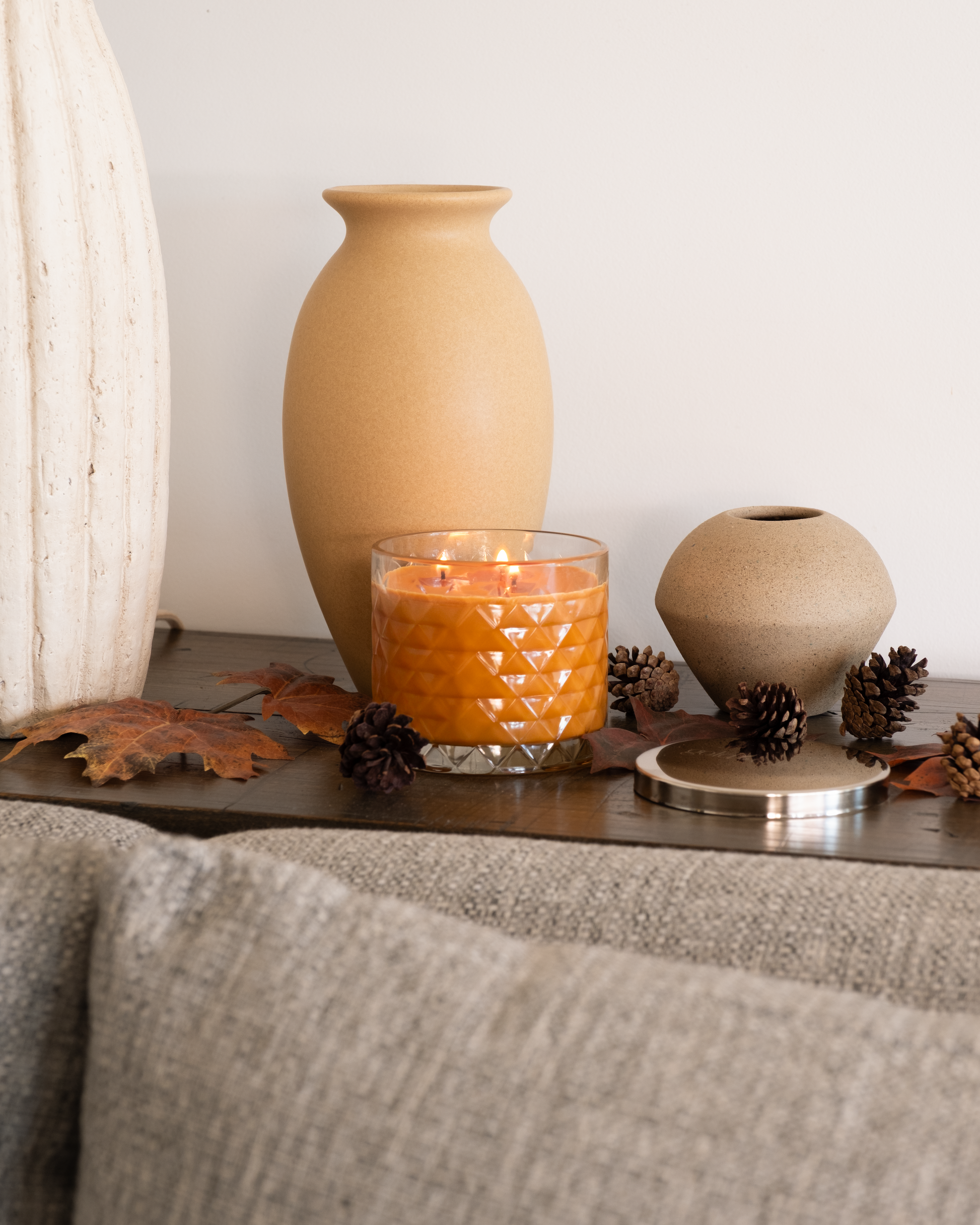 The aroma of sweet peaches and baked pumpkin drifts through the room as you curl up with a good book and a cozy blanket.