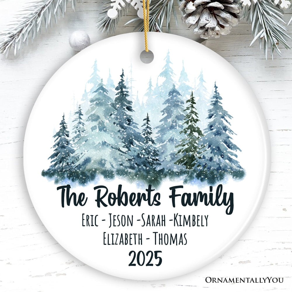 Personalized Family Keepsake Christmas Ornament, Watercolor Winter Forest Trees