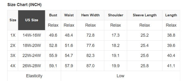 Plus Size Info: See size chart for approximate measurements