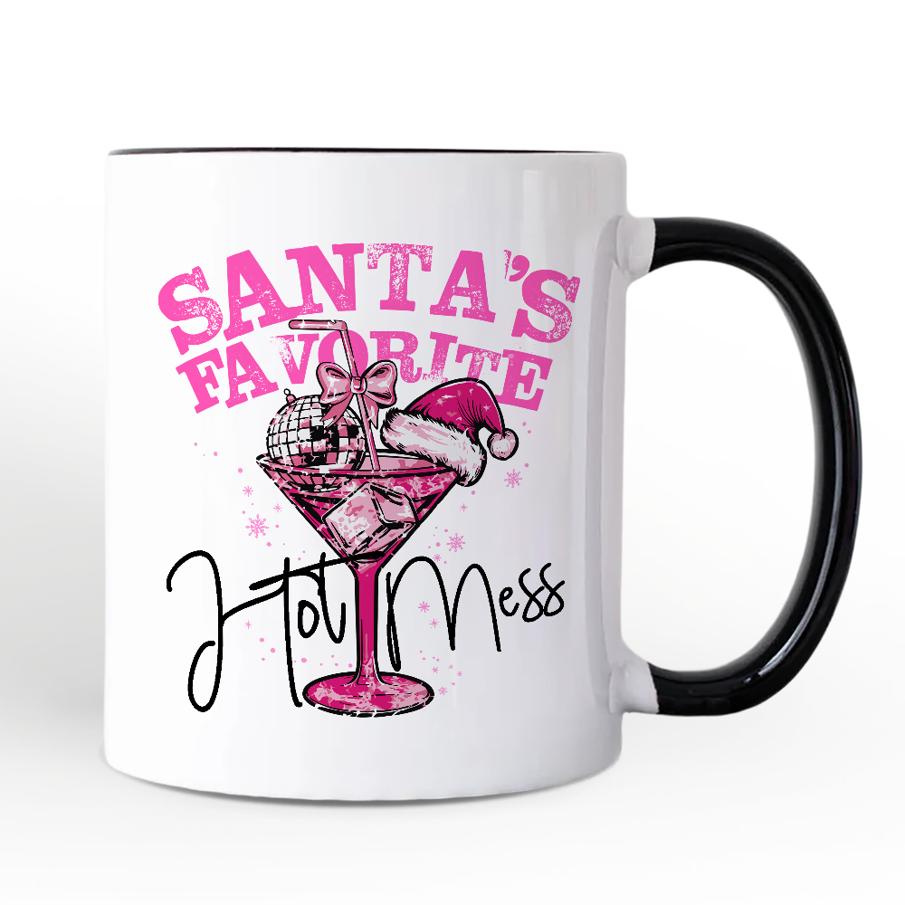 Santa’s Favorite Hot Mess Personalized Mug, Pink Martini Retro Disco Christmas Gift with Custom Name