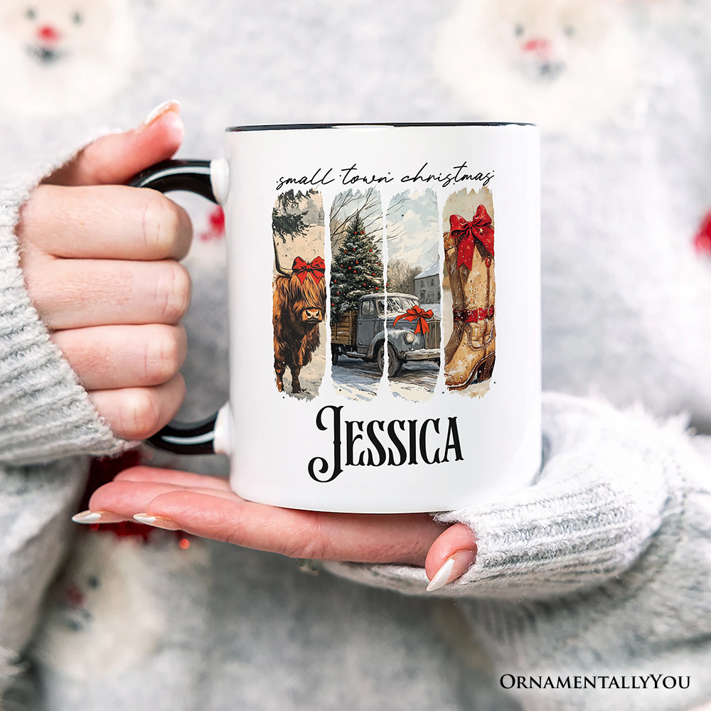 Small Town Christmas Personalized Mug, Highland Cow Rustic Western Cowgirl Holiday Gift with Custom Name