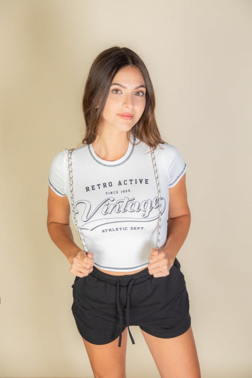 Bring retro vibes to your wardrobe with this vintage-inspired graphic tee. Designed with a cropped silhouette, contrast stitching, and bold lettering, this top adds a sporty yet trendy edge to any outfit. Perfect for pairing with high-waisted denim or joggers for an effortlessly cool streetwear look.